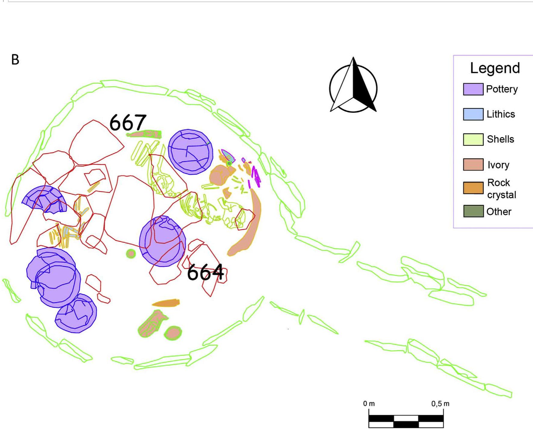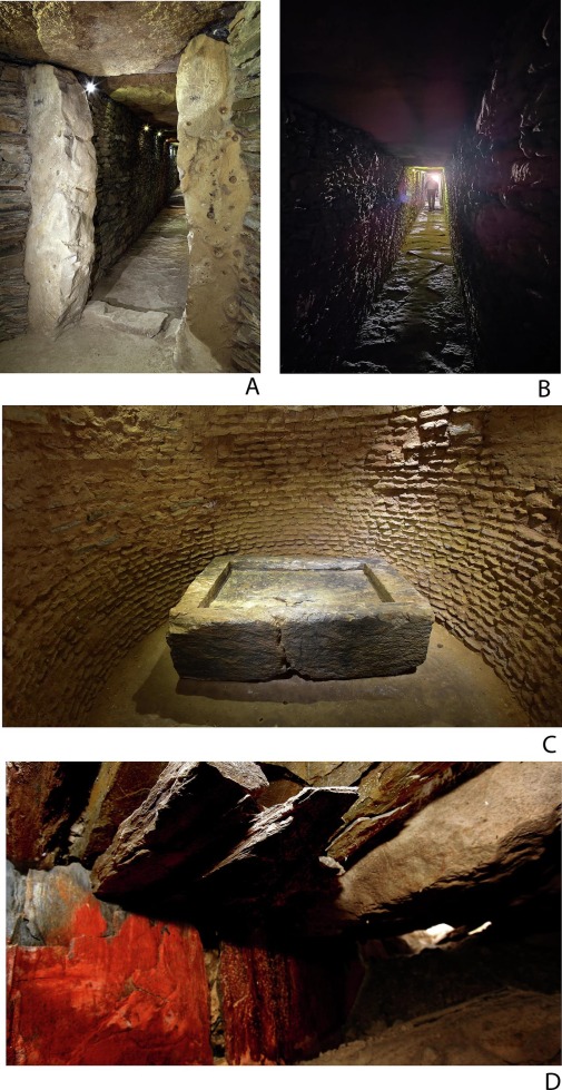 The main features discussed in the text, showing the location of the rock crystal artefacts: A) Montelirio tholos: B) PP4-Montelirio Sector Structure